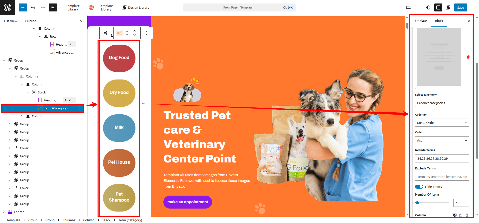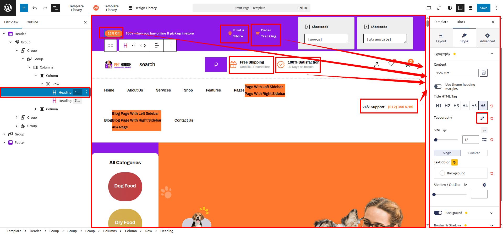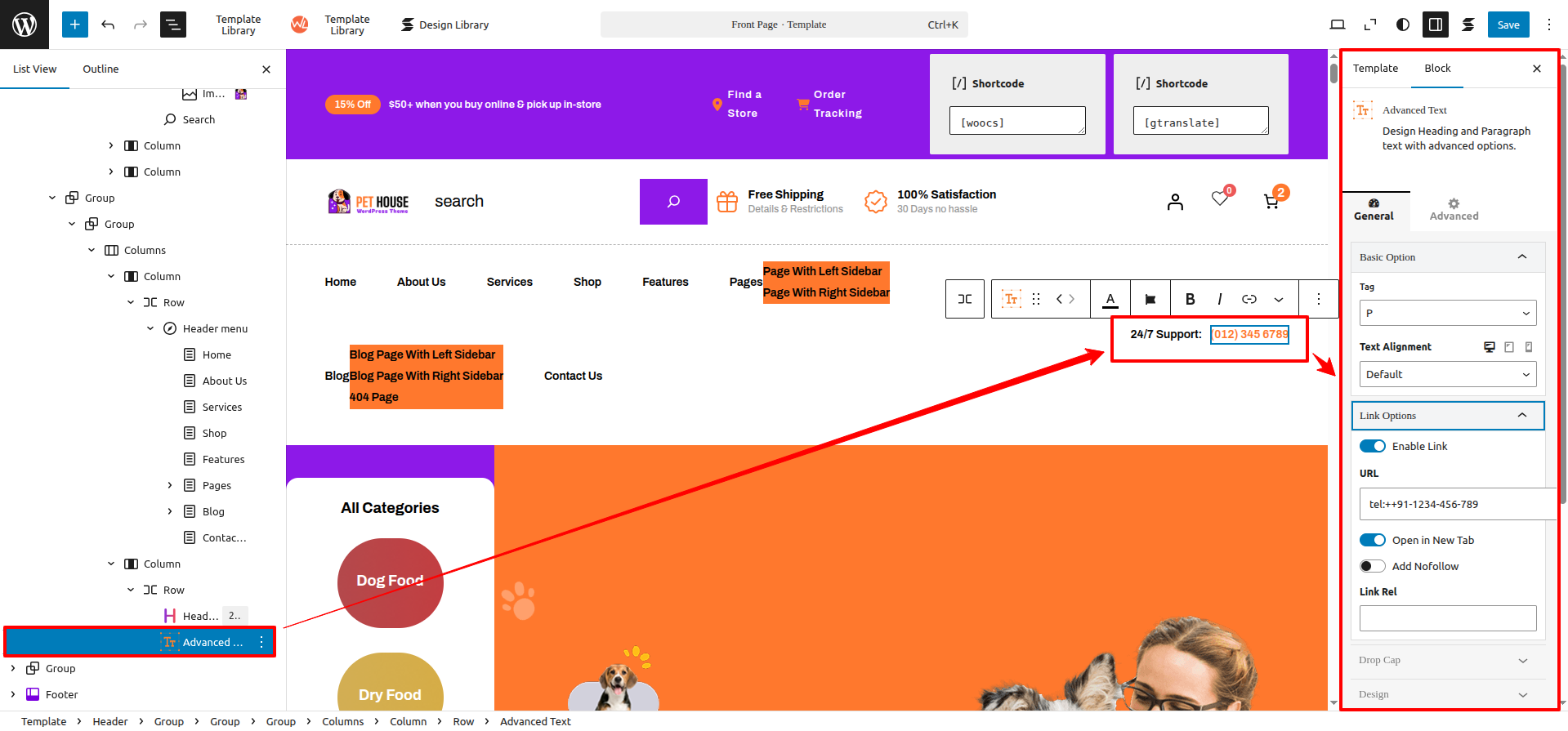 4. Some sections use Gutentor plugin blocks (e.g., for links, contact info, call, or email). Locate those blocks, go to their settings, and apply minor changes as needed.