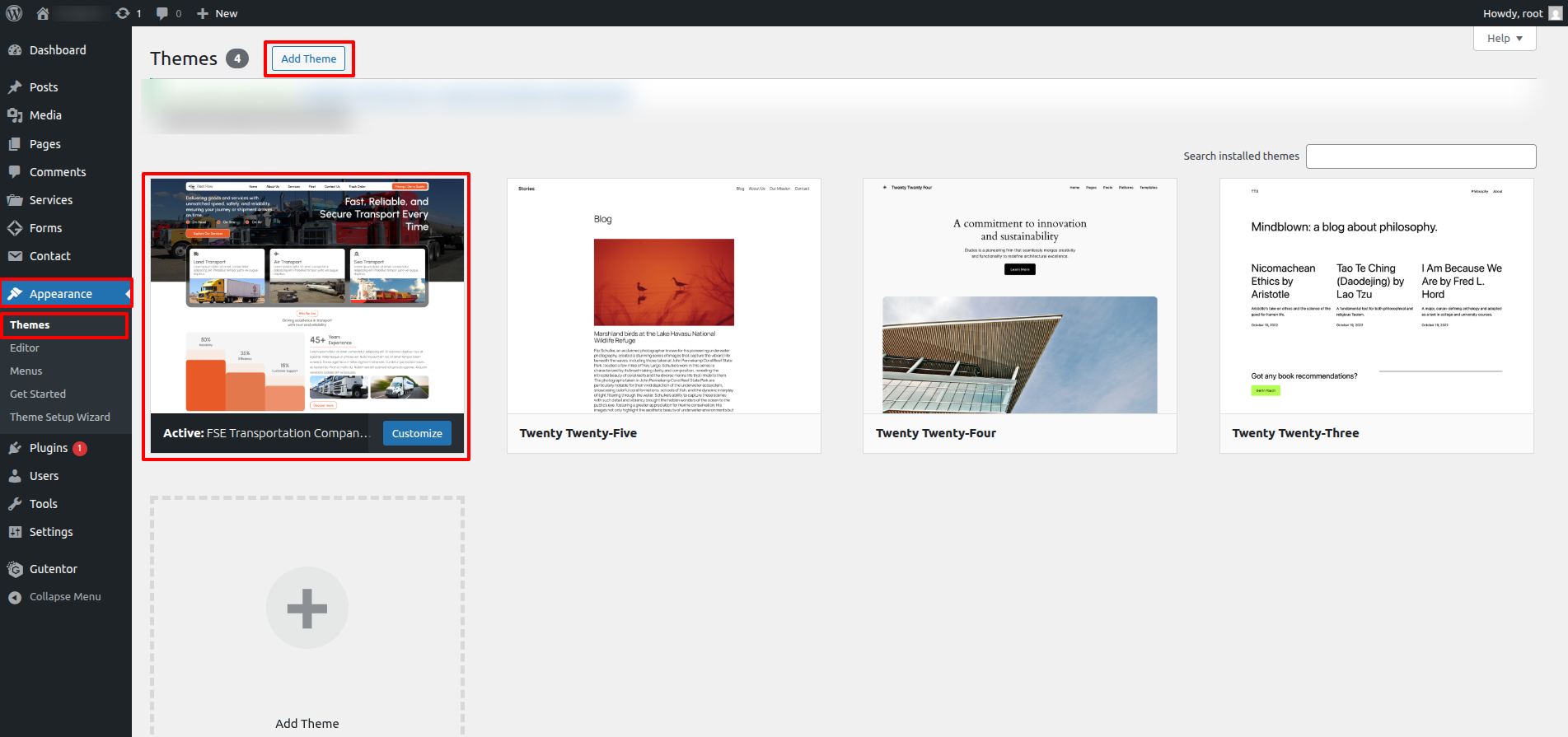 - Go to the menu Appearance > Themes and click the Add New Theme button.