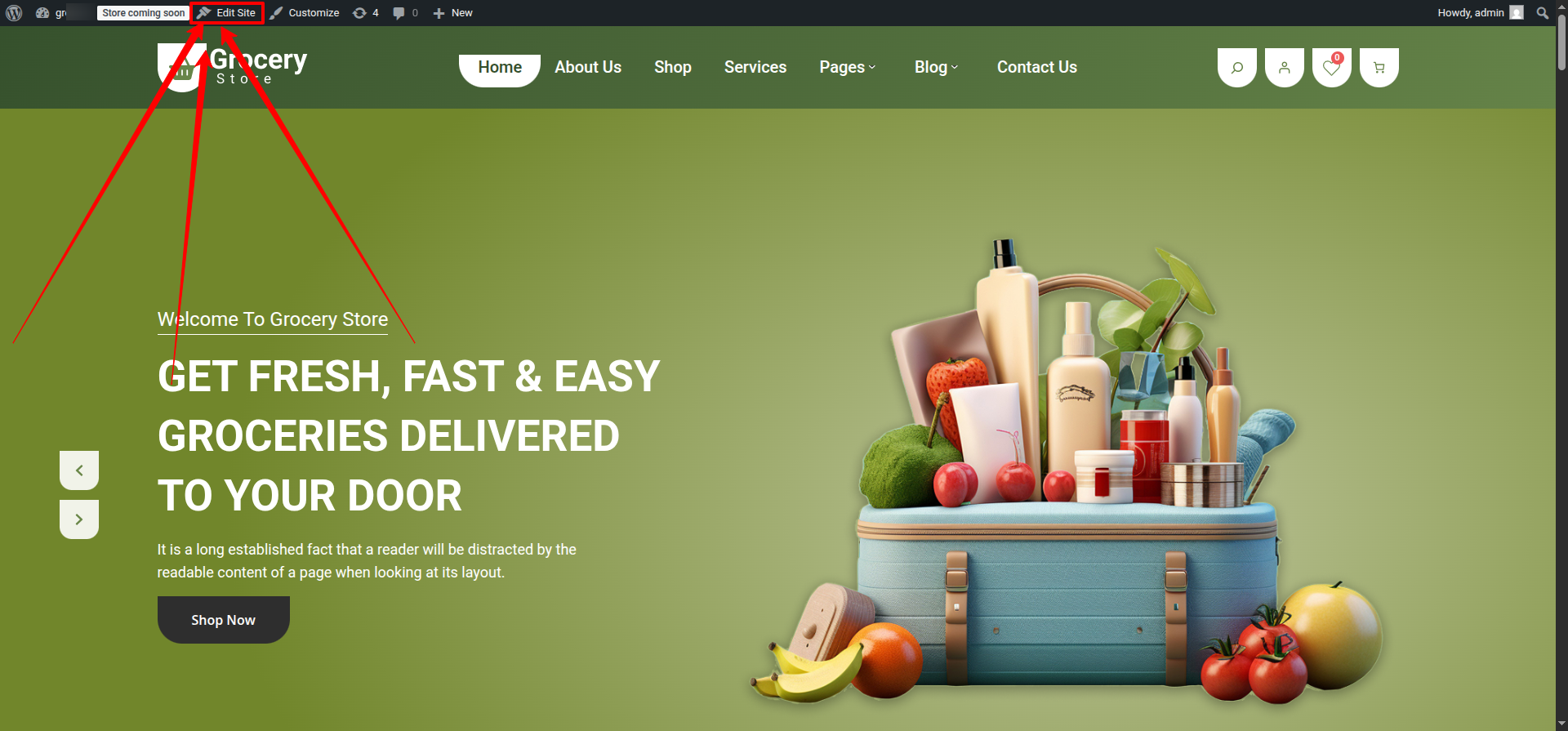 Visit your site's URL and select the "Edit site" link from the admin bar to initiate the editing process.