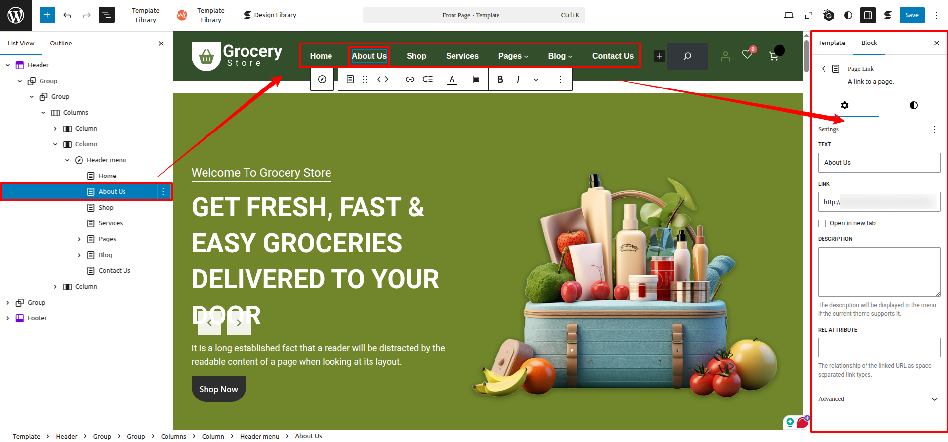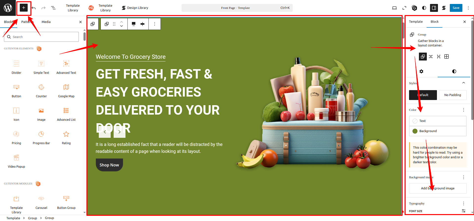 4. Some sections use Gutentor plugin blocks (e.g., for links, contact info, call, or email). Locate those blocks, go to their settings, and apply minor changes as needed.