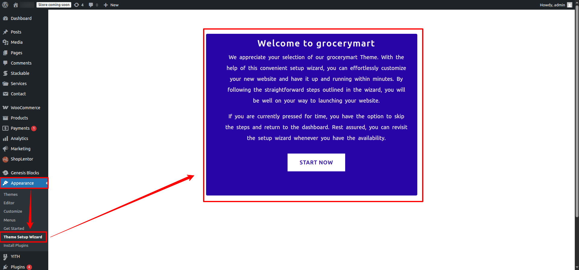 - Navigate to Appearance > Theme Setup wizard