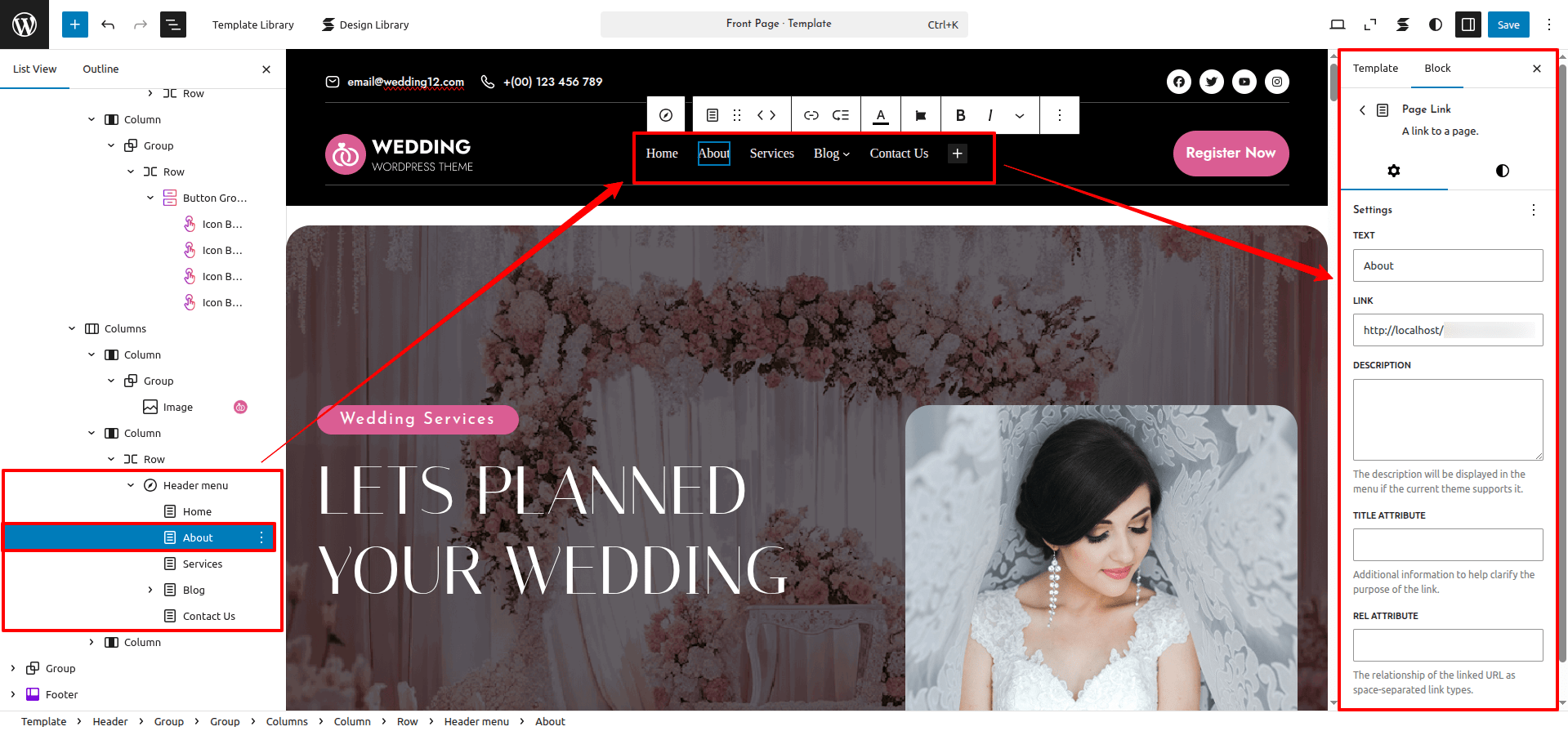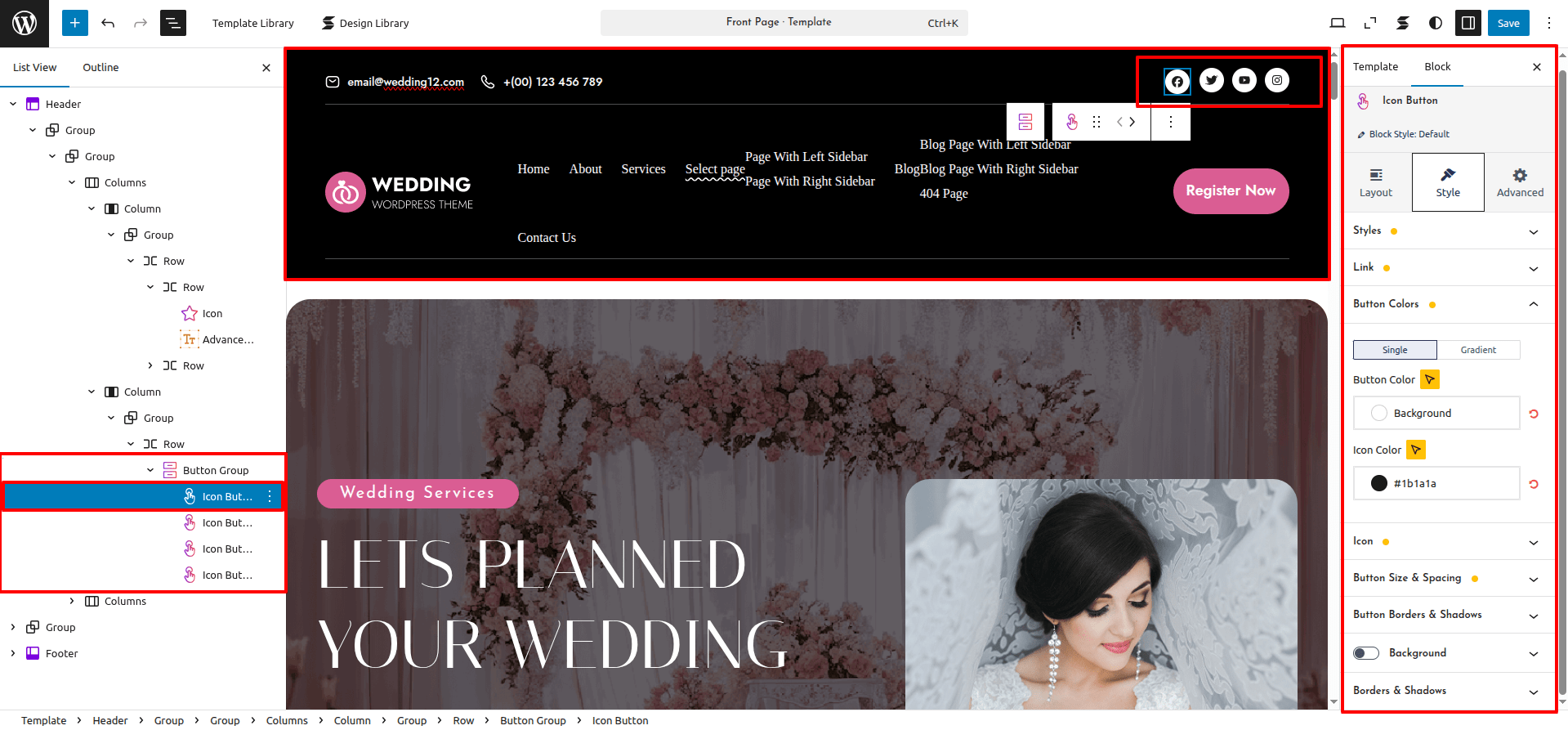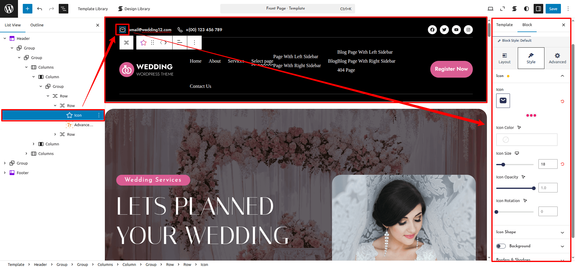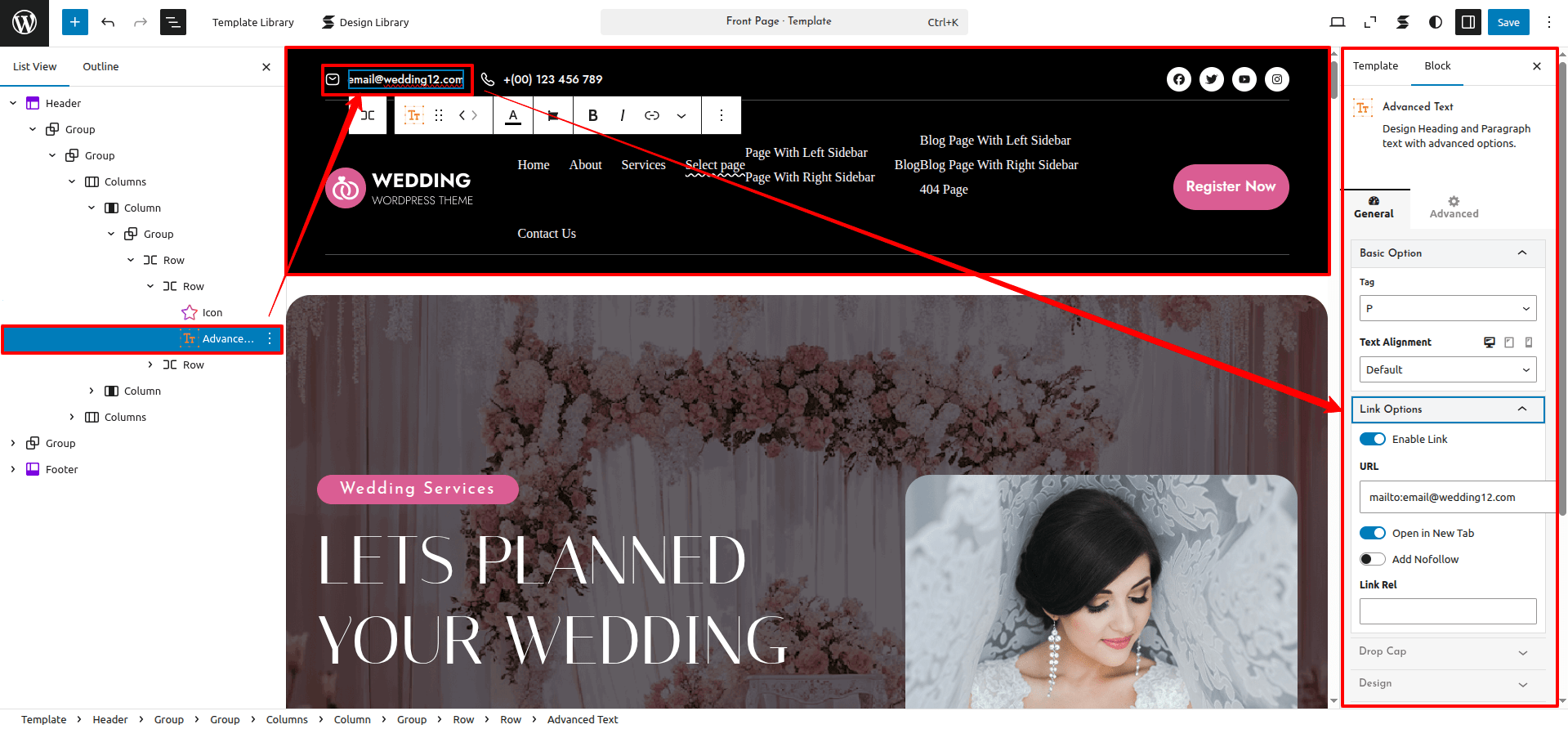 4. Some sections use Gutentor plugin blocks (e.g., for links, contact info, call, or email). Locate those blocks, go to their settings, and apply minor changes as needed.