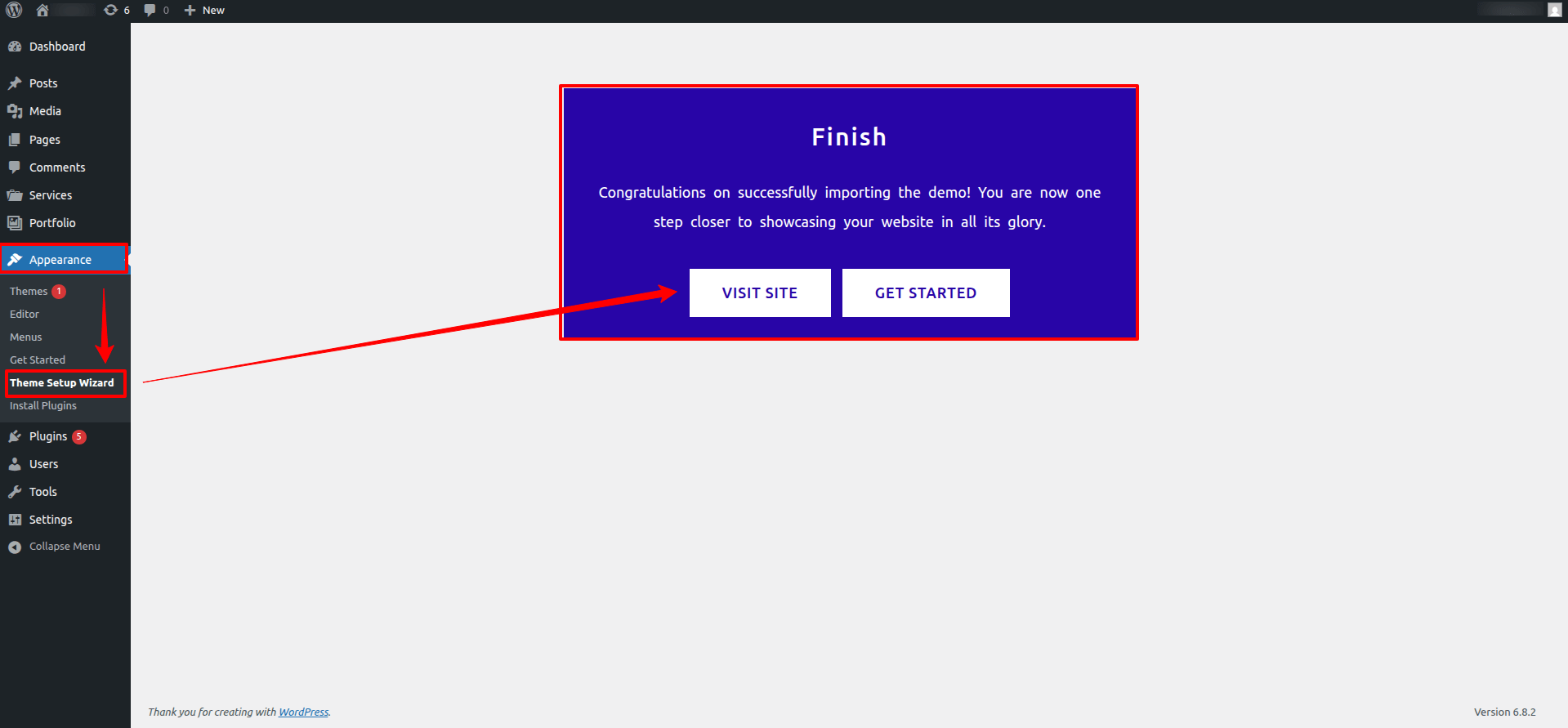 Now, your theme is set up, and you can visit the site or go to "get started" where you will find information about the theme.