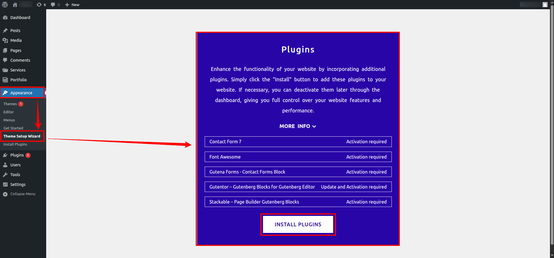 2. Click on "Install Plugins" button to install pugins used in theme.
